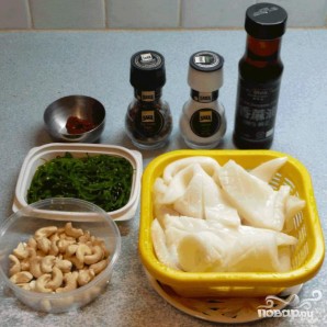 Слейте молоко и промойте треугольники. Разогрейте растительное масло на сковороде с толстым дном. Положите кальмары на сковороду и сразу посыпьте солью и добавьте пасту чили. Обжаривайте морепродукты в течение 3 минут, периодически переворачивая. Добавьте орехи кешью. Выложите японский салат Вакамэ на тарелку, сверху разместите обжаренные кальмары с орехами. Подавайте немедленно. |