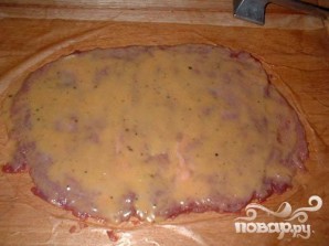 3. Используя деревянный молоток, аккуратно отбейте грудки до толщины около полсантиметра. Начинайте с центра и двигайтесь к краям. Разместите обе грудки на пергаментной бумаге. | |